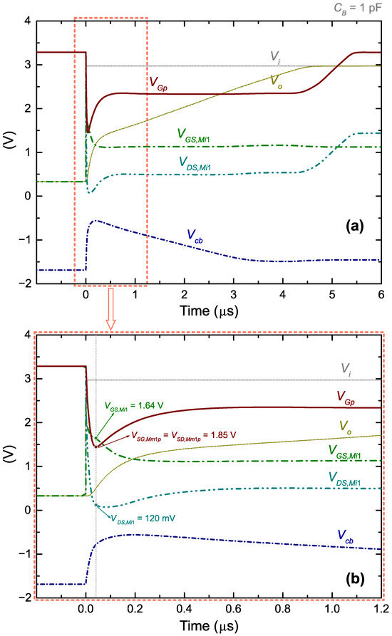 Figure 9 shows other relevant PSRE internal voltages during the low-to-high transient. Specifically, traces marked as , and correspond to the gate-source voltage of Mi1, drain-source voltage of Mi1 and gate voltage of Mm1p-Mm2p, while the voltage across and the input and output voltages are also plotted for reference. Interestingly, in the magnified view of Figure 9b, it appears evident how, at the very beginning of the transient, during the PSRE turn-on process, the input transistor Mi1 finds itself to shortly work in the triode region (), while the output transistor Mm2p markedly reaches strong inversion, thanks to the large step. These findings validate the analytical model proposed in Section 3.2 to describe the CB-assisted PSRE turn-on process.
