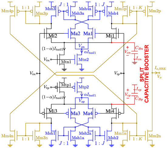 Figure 2 shows the transistor-level schematic view of the PSRE with dynamic threshold currents (DTC) [35], augmented by the addition of the capacitive booster , as proposed in [30]. In the following, we refer to this configuration as the standard CB configuration to distinguish it from the novel approach introduced in Section 4.