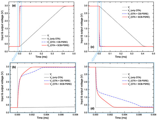 Response to square-wave stimulus (unity-gain configuration, nF). The proposed SCB-PSRE-assisted OTA is compared with its previous versions, all designed with the same quiescent supply current of 4 µA. The CB-PSRE and SCB-PSRE solutions have been implemented with pF and pF, respectively. (a,b) Transient waveforms around low-to-high input transition. (c,d) Transient waveforms around high-to-low input transitions.