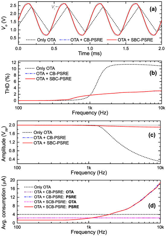 In Figure 14, the same three designs are tested under sinusoidal stimuli, again in unity-gain configuration with a load capacitance of 1 nF. Specifically, Figure 14a shows the waveforms obtained when the input signal is generated with 2-kHz frequency and peak-to-peak amplitude equal to 2 Vpp. While the OTA alone is unable to correctly follow the input signal, due to clear SR limitations giving rise to a triangle-wave output, the PSRE-assisted OTA correctly tracks , with only small discrepancies before sine-wave peaks due to PSRE turn-off events. Figure 14b–d show total harmonic distortion (THD), peak-to-peak amplitude, and average consumption, respectively, as a function of frequency, while the input sine-wave amplitude is kept equal to 2 Vpp. While the OTA alone incurs THD and amplitude degradation just above 1 kHz, the PSRE-assisted designs achieve more limited THD increase as a function of frequency, while the amplitude is roughly kept constant. As expected, no significant differences can be noticed, in this simulation, between the CB-PSRE and the SCB-PSRE designs, since the SCB technique is primarily meant to optimize responses to fast input voltage steps, rather than gradual, continuous variations of as encountered with a sinusoidal stimulus. It is also worth noting that, while all designs were supplied with the same total quiescent current, the average dynamic consumption of the PSRE block increases as a function of frequency, as made evident in Figure 14d; however, this portion of consumption is entirely employed to drive the load capacitance during slewing transients. Hence, this effect highlights how the PSRE block allows efficient automatic adjustment of the average consumption depending on the load current requirement.