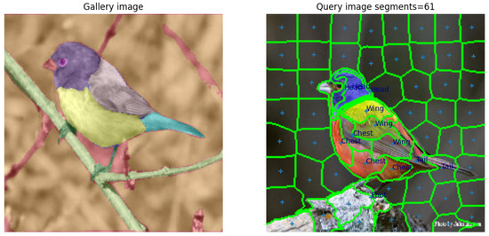 where the ReLU function clamps the negative values to zero and the exponent d helps to emphasize the difference between the hyperpixel features. When integrated with Hough voting, this similarity function with increases matching performance by reducing the impact of noisy activations. The centroids of each segment of the query image act as key predictors in the HyperPixelFlow process, allowing for matching of the corresponding regions and transferring parts from the gallery image to the query image. The combined use of HPF with SLIC enables the assignment of human-aligned names to superpixel groups, thereby identifying meaningful concepts. Figure 2 shows the result of the transfer of part labels from a labeled query image on the right to an unlabeled gallery image on the left.