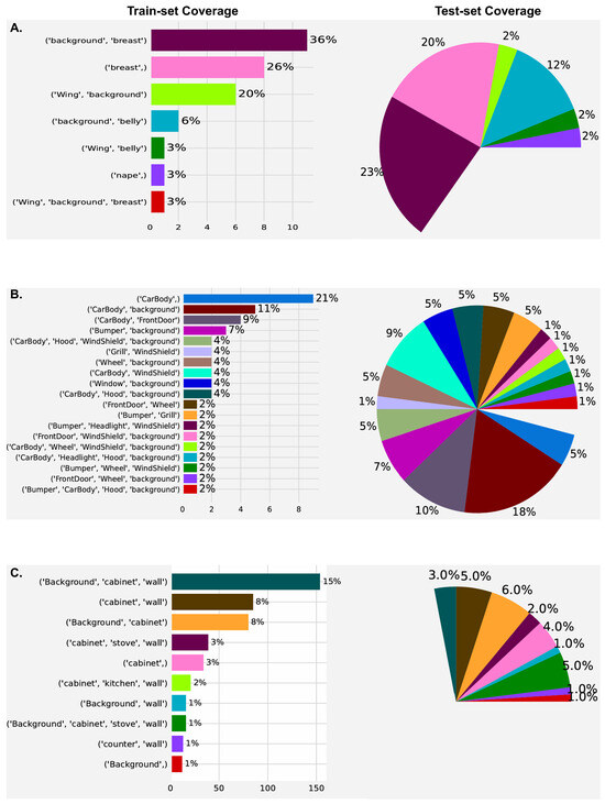 Visualization of global explanations for ResNet101 architecture decisions on classes “Indigo Bunting” (Panel-A), “Bugatti Veyron” (Panel-B), and “Kitchen” (Panel-C) from CUB200, ADE20k, and Stanford Cars datasets, respectively. Bar plot shows coverage of each MSX in train set, whereas pie chart indicates coverage of MSX in test set with same color.