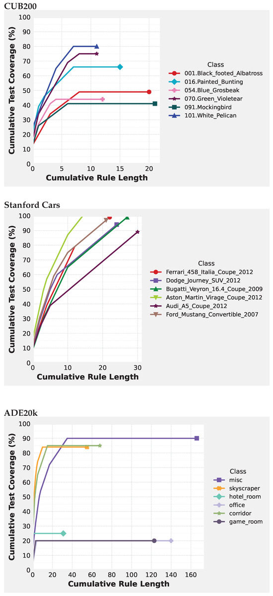 In Figure 5 we plot the cumulative test coverage in class against the length of the rules explaining the training dataset for the three datasets, focusing on the top three and bottom three classes when sorted by test coverage. Unlike the average test coverage reported in Table 1, this figure aims to capture the varying levels of difficulty in explaining different classes. Ideally, high test coverage should be achieved with the smallest set of rules. The figure highlights the diversity in the rate of test coverage gained with each additional rule. Notably, the “White Pelican,” “Aston Martin Virage Coupe 2012,” and “miscellaneous” classes achieved the highest class test coverage for the CUB-200, ADE20k, and Stanford Cars datasets, respectively, with “Aston Martin Virage Coupe 2012” being able to explain all test and train examples with as few as 17 rules. The figure also visually demonstrates the higher intraclass deviation in mean test coverage for the ADE20k and CUB-200 datasets, whereas classes in the Stanford Cars dataset achieve higher test coverage with fewer global rules.