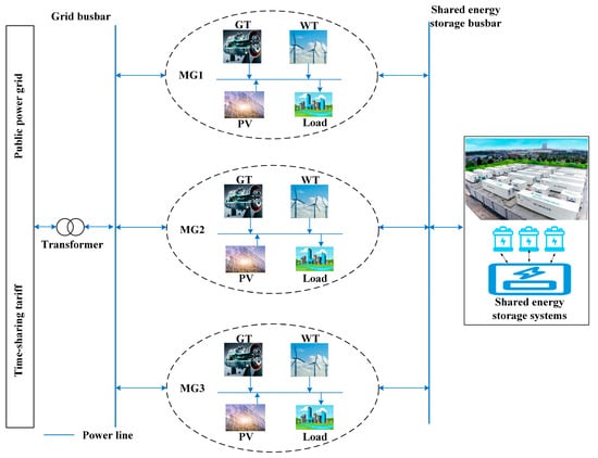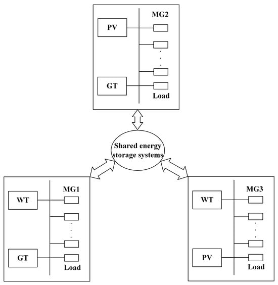 Distributed energy within a single microgrid is characterized by intermittent power generation, random power output, and geographic dispersion, which makes it difficult to realize efficient conversion and utilization of energy and fails to meet the differentiated energy demand of users. Therefore, this paper constructs a microgrid cluster system containing SES to reduce the cost burden of independently configuring energy storage devices for microgrids and to improve the system power supply reliability and comprehensive economy. As shown in Figure 1.