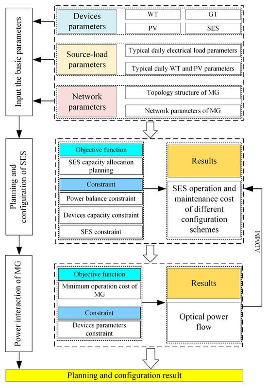 The solution approach involves alternating iterations between the upper-level SES system capacity allocation planning and the lower-level microgrid local optimal scheduling problem, as illustrated in Figure 3.