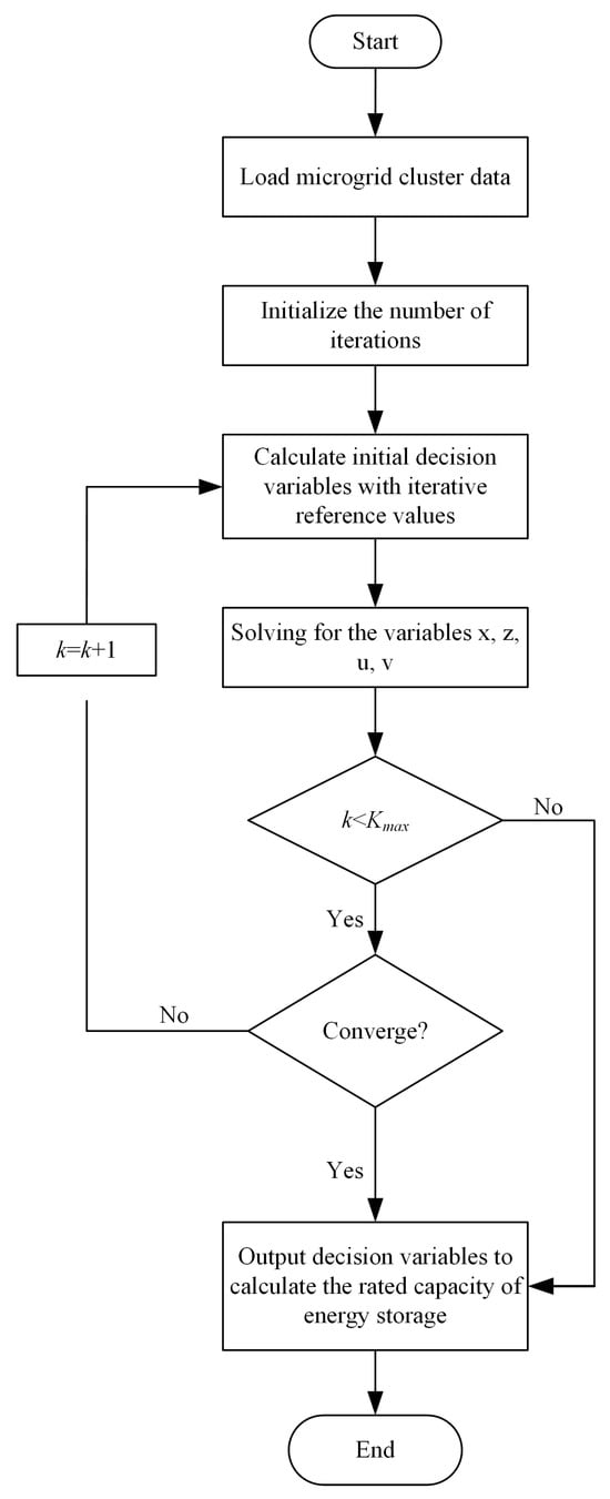 The upper-level capacity allocation problem is solved using the ADMM algorithm, and the optimal solution is obtained by joint distributed solving of multiple microgrid subjects, followed by passing the most known parameters of the SES capacity and bus interaction power to the lower-level microgrid optimization operation model. The lower-level optimization problem is calculated by the multi-microgrid main control center using a centralized solution method, and after the solution is completed, based on the output and cost data of each unit, the updated SES capacity and bus interaction power are returned to the upper level and iterated through the cycle until the optimal solution is found.