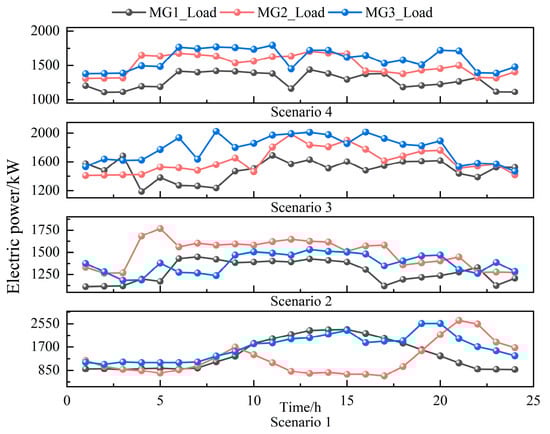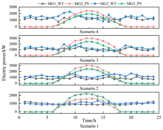 There are multiple input and output parameters with uncertainties in microgrids. Therefore, shared energy storage capacity allocation planning should be conducted within an uncertainty analysis framework to ensure the reliability of the final planning scheme. To mitigate the impact of randomness and uncertainty caused by fluctuations in renewable energy output and load on the capacity planning of shared energy storage systems in microgrid clusters, this paper employs scenario analysis to obtain typical daily renewable energy output and load data curves under four different scenarios [], as shown in Figure 5 and Figure 6. The process of scenario analysis is as follows: