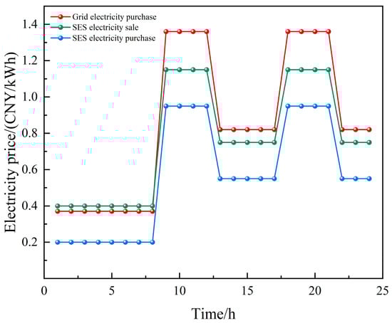 Due to the geographic proximity of the microgrids inside the cluster, each microgrid is established to interact with the external grid simultaneously at the same tariff. To guarantee the profitability of the SES system, it is essential that the power sales price of the energy storage system exceeds the electricity purchase price, together with a judicious selection of the price range for buying and selling electricity. In this paper, the difference between the fixed purchase and sale price range is set to be 0.2 CNY/(kW·h), as shown in Table 1.