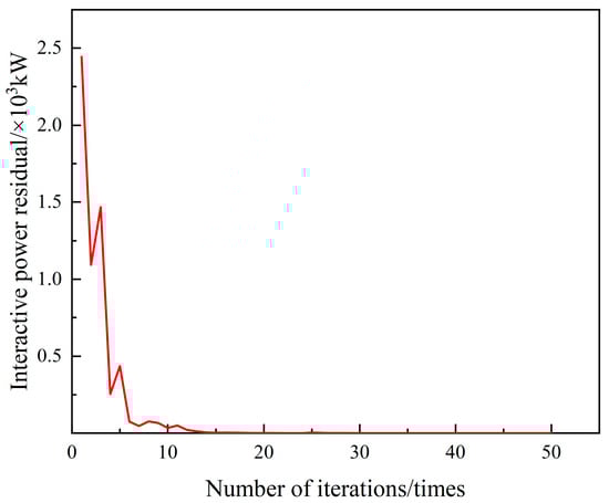 The electricity price curves for the external grid and the SES system, as depicted in Figure 7, are derived from the tariff data presented in Table 1. The ADMM method discussed in the preceding section is employed to execute a two-tier optimal allocation of the capacity within the microgrid cluster system that includes the SES. The algorithm sets the solution period T to be 24 h with a time interval of 1 h, the maximum interaction power of each microgrid through the SES bus to be 2000 kW, the penalty factor ρ = 1 × 10−4, the convergence parameters εabs and εrel to be 1 × 10−3 and 1 × 10−5, respectively, and the maximum number of iterations Kmax = 1000. The iterative convergence process is shown in Figure 8, which converges to a steady state at the 20th iteration, and at the 30th iteration, the residual convergence, though slightly fluctuating, subsequently converges to a steady state.
