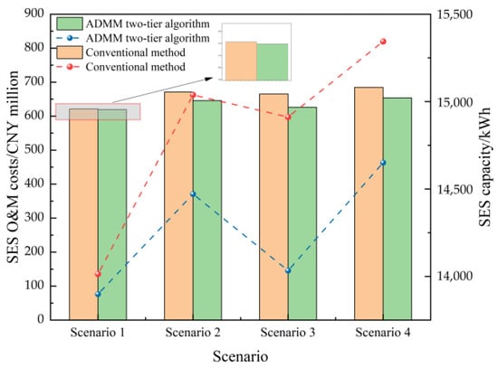 To improve the computational efficiency of the research presented in this paper, the previously described basic data were employed to create the ADMM algorithm and conventional calculation programs using Matlab (R2020b), and the SES capacity of the specified models was configured and planned across four scenarios, as shown in Figure 9 and Figure 10.