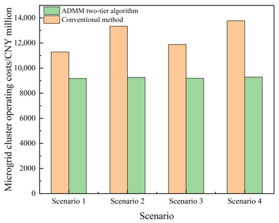 As shown in Figure 9 and Figure 10, the ADMM-based two-tier optimization configuration algorithm proposed in this paper has a significant effect in reducing the operating costs of microgrid clusters and optimizing shared energy storage capacity compared to traditional capacity planning methods. Due to the uncertainty of renewable energy output and load demand in microgrids, the two methods show significant data differences in different scenarios. In Scenario 1, the ADMM two-layer optimization configuration algorithm reduced shared energy storage maintenance costs by 0.26% and microgrid cluster operating costs by 18.72% compared to traditional shared energy storage capacity configuration planning methods. In Scenario 3, shared energy storage maintenance costs were reduced by 5.89%, and microgrid operating costs were reduced by 22.61%.