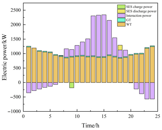 Taking Scenario 1 as an example, we analyze the results of the two-tier distributed optimization of a microgrid cluster with shared energy storage. Output of the first microgrid energy supply equipment, as depicted in Figure 11. As can be seen from the figure, 72.02% of the power output in the first microgrid originates from WT, and GT mainly undertakes the task of power regulation, and its actual power generation share is only 2.34%. Since the objective function takes the minimization of system operating cost as the optimization objective, the cost of power interaction through the SES bus is lower for the microgrid compared to GT generation, so 18.71% of the power output in microgrid1 comes from power interaction, which reflects the important role of SES in reducing the system operating cost. For example, during the peak period from 8:00 to 19:00, when the turbine output cannot meet the load demand, the first microgrid interacts with other microgrids through the SES bus to meet the load energy demand, thus effectively reducing the overall operating cost of the microgrid system. During the low energy consumption period, microgrid1 transmits the surplus power to other microgrids through the SES bus, taking into account the environmental protection and economy of the system. SES strictly follows the dynamic equilibrium relationship between renewable energy power generation and energy-using loads. For example, at 9:00 in the figure, when the renewable energy power generation is abundant, the SES system carries out the charging state, and at 18:00, when the renewable energy output cannot meet the load energy-using demand or the GT power generation cost is higher, the SES system turns to the discharging state so as to maintain the stable operation of the system.