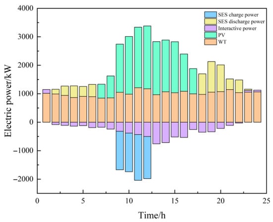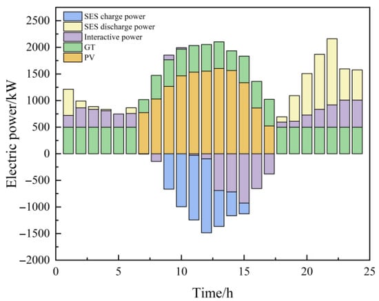 Figure 12 illustrates the power output of the second microgrid’s energy supply apparatus, wherein PV generation predominates among its renewable energy sources; yet, only 53.0% of the power output is attributable to PV, owing to the intermittency and unpredictability of the PV unit’s output. Compared to the microgrid1, the second microgrid has a significantly higher percentage of GT output, with 45.33% of the power output being taken by the GT. As can be seen from the figure, during the 9:00–14:00 time period, when the revenue from selling electricity to the SES system is higher than the cost of GT generation, the second microgrid maximizes the microgrid revenue by boosting the system’s power generation and selling the excess power to the SES system. During the peak hours of 18:00–24:00, the second microgrid system meets the load energy demand in the region mainly through SES system discharges and GT generation. During the 24 h operation cycle, in order to promote the synergistic and optimized operation of the microgrid cluster, 43.88% of the power in the second microgrid achieves power interaction by charging to the SES system to complete the temporal and spatial transfer of energy, which highlights the key regulating role of the SES system. This mode of operation is of great significance in promoting the local consumption of renewable energy, enhancing the economic efficiency of the microgrid cluster system, reducing the comprehensive energy costs of users, and contributing to the construction of a more efficient, economical, and environmentally friendly microgrid cluster energy system.