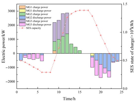 When the sum of the purchased power of the microgrids with power purchase demand is greater than the sum of the sold power of the microgrids with power sale demand, power is first transmitted from the microgrids with surplus renewable energy generation to the microgrids with insufficient power through the SES system bus. As shown in Figure 15, the second microgrid is equipped with only a GT and PV power generation system, which generates high power during the daytime when there is sufficient light, and the power output is significantly reduced at night, so it is difficult to meet the load energy demand during the hours of 0:00–6:00 and 20:00–24:00, and at this time, both the first microgrid and the third microgrid transmit power to it through the SES bus. During the 10:00–17:00 time period, owing to the ample solar energy resources, the photovoltaic power generation in the second microgrid is plentiful and delivers electricity to microgrid1 via the bus. Given that the power purchase tariff of the SES system is inferior to that of the external grid, in instances of energy supply deficiency within a microgrid, priority is given to purchasing power from the SES system, while procurement from the external grid is regarded as secondary.