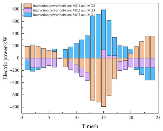 When the sum of power purchased by microgrids with power purchase demand is less than the sum of power sold by microgrids with power sale demand, even after the bus power interaction of the SES system, the microgrid cluster system still presents a power surplus state, and in order to avoid the waste of renewable energy power generation, enhance the level of local consumption of renewable energy and the efficiency of comprehensive utilization of energy, each microgrid sells the surplus power to the energy storage system. This strategy not only avoids the phenomenon of wind and light abandonment but also increases the revenue of each microgrid through the sale of electricity and reduces operating costs. As shown in Figure 15, from 9:00 to 15:00, the second microgrid and the third microgrid sell electricity to the energy storage system, which realizes the economic benefits.