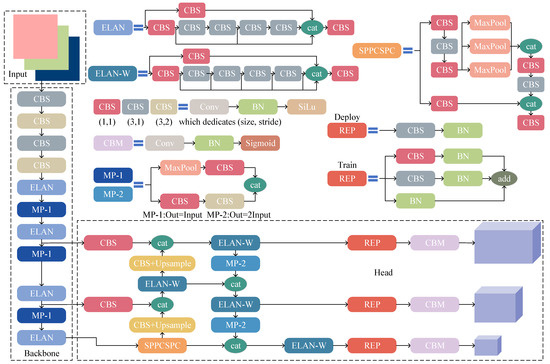 YOLOv7 is one of the most advanced YOLO algorithms available, and it has achieved leading speed and accuracy in the range of 5 to 160 frames per second (FPS) on the MSCOCO dataset [9]. The input, backbone, and head constitute the main structure of the YOLOv7 network, as shown in Figure 1. At the input side, the YOLOv7 network uniformly adjusts the size of the input image to the size of 640 × 640 and passes it to the backbone network, after which the image data undergoes convolutional transformation by the four groups of CBS modules; the function of the backbone network is to regulate the overall gradient path of the network through the ELAN module. This enables the network to achieve the gradient path, even in instances where the stacking is inadequate. The backbone network controls the overall gradient path of the network through the ELAN module, which enables the network to realize efficient learning and convergence even in the case of deep stacking, thus improving the speed of algorithmic reasoning while improving the accuracy; the head network adopts the same multi-layer feature extraction strategy as the YOLOv3 series, i.e., the output of the backbone network is taken from three different features as the base data for prediction, and the different dimensional features go through the feature pyramid when making predictions [10] and the path fusion network [11] to realize different levels of information fusion and complementarity. Eventually, the features of different dimensions are output as results through the reparameterized convolutional layer. The reparameterized convolutional module integrates the convolutional layer and the BatchNorm layer, which consists of a set of 3 × 3 and a set of 1 × 1 convolutions as well as constant mapping at the time of training, and it was reparameterized to a single 3 × 3 convolution at the time of inference, which improves algorithmic performance.