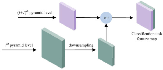 To address the aforementioned challenges, distinct feature networks have been designed for different tasks, and a task-specific context decoupling (TSCODE) framework has been developed. The classification task demands richer contextual semantic information; therefore, deep features are fused with shallow layers during classification. Conversely, the regression task requires more detailed spatial information, so adjacent feature layers are fused during regression. The classification and regression feature maps are illustrated in Figure 4 and Figure 5, respectively.