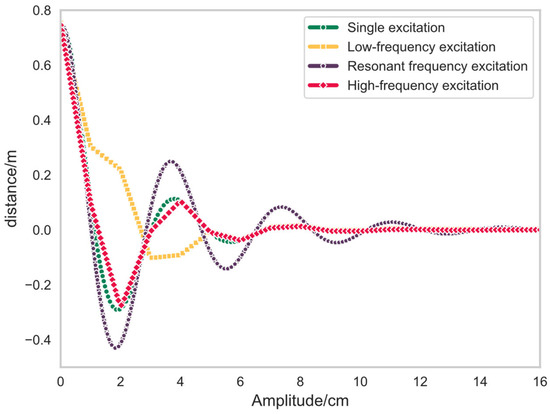 From Figure 9, it can be clearly observed that when the frequency of the excitation force matches the intrinsic frequency of the wire, it will lead to the resonance phenomenon of the wire, and this resonance phenomenon will significantly enhance the vibration amplitude of the wire, making the vibration signal propagate farther.