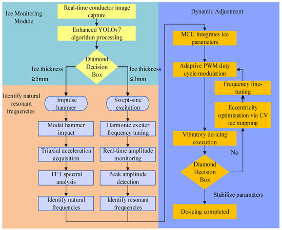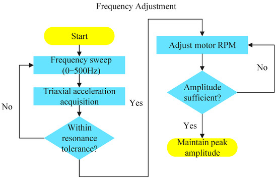 The device utilizes a BMI270 six-axis gyroscope to monitor amplitude and combines the amplitude data with the ice state assessment results from the improved YOLOv7 to feed back to the main control unit, which adjusts the PWM duty cycle to match the vibration frequency with the wire’s natural frequency. The frequency adjustment process is illustrated in Figure 10. Simultaneously, the main control unit receives ice distribution information to dynamically adjust eccentricity. If the ice is concentrated on one side of the wire, the system increases eccentricity to enhance the amplitude of a single side; if the ice is uniformly distributed, a symmetric vibration mode is employed.
