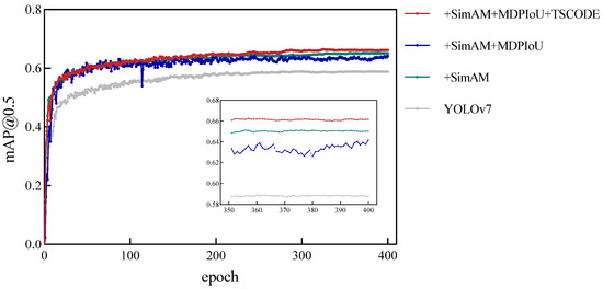 Comparison of mAP@0.5 after introducing different improvement methods for the YOLOv7 algorithm.