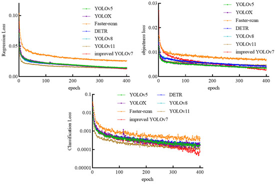 As shown in Table 3 and Figure 13, the traditional two-stage detection algorithm Faster R-CNN is time-consuming and exhibits low accuracy. The YOLOv5, YOLOX, and DETR algorithms demonstrate comparable performance in terms of accuracy and detection speed. YOLOv8, YOLOv11, and the enhanced YOLOv7 algorithm display very similar detection capabilities. Figure 14 illustrates that the improved YOLOv7 algorithm experiences more rapid declines in various loss functions during training and achieves a lower final loss. In summary, the enhanced YOLOv7 algorithm outperforms the others in accuracy, recall, mAP, and detection time, indicating its superior capability for line ice detection.
