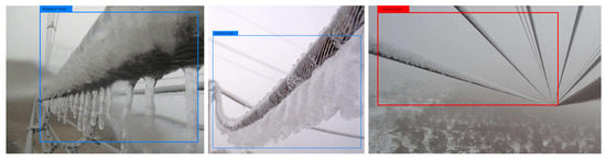 In order to verify the de-icing performance of the device in engineering application scenarios, this study carried out outdoor de-icing experiments in a −8 °C environment in Qujing City, Yunnan Province. Figure 15 shows the field detection results of the robot’s over-ice detection module, and the results show that the improved YOLOv7 algorithm is able to better identify the over-iced line, distinguish the thickness of the line’s ice, and locate the over-iced lines.