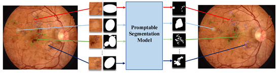 Illustration of promptable retinal lesion segmentation. The arrows in different colors mean different types of lesions.