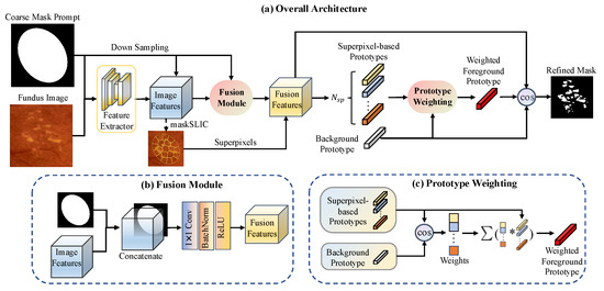However, the inherent imprecision of coarse annotations presents a significant challenge for prototype extraction. In the case of small or irregularly shaped lesions, coarse prompts often encompass substantial background areas. When the foreground prototype is generated by simply aggregating features (e.g., through average pooling) within the entire prompted region, a considerable amount of background information is incorporated, resulting in “prototype dilution”. This significantly undermines the accuracy and discriminative power of the lesion prototype. Thus, we introduce an innovative superpixel-guided prototype weighting module. Within the coarse prompt region, this module first employs superpixel segmentation to divide the area into multiple subregions based on local feature similarity, computing a representative sub-prototype for each subregion. Subsequently, the distinctiveness of each sub-prototype from the global background prototype is evaluated, and an adaptive weight is assigned—subregions that are more dissimilar to the background (and therefore more likely to correspond to true lesion) receive higher weights. Finally, all sub-prototypes are fused in a weighted manner to form a foreground prototype that is more robust to background interference and more accurately captures the true characteristics of the lesion.
