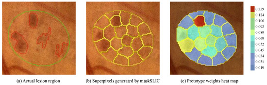 Illustration of superpixel-guided prototype weighting. (a) The actual lesion region (green outline) within the coarse prompt. (b) The prompt region is partitioned into superpixels. (c) A heat map of the prototype weights. The color bar indicates the weight value, where warmer colors (red) represent higher weights assigned to sub-prototypes that are more dissimilar to the background and thus more likely to be true lesion areas.