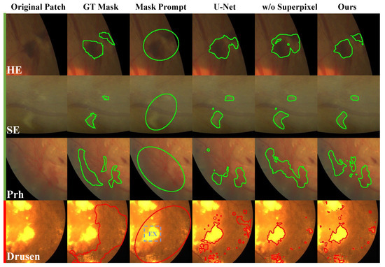 Firstly, we benchmarked our model against several state-of-the-art fully supervised fundus lesion segmentation methods [2,4], which do not utilize any mask prompt information. These serve as baselines to assess the achievable segmentation performance without auxiliary prompt guidance.