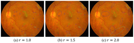 In clinical scenarios, ophthalmologists often employ coarse elliptic annotations to quickly cover multiple, disconnected lesion regions, introducing varying degrees of annotation coarseness. To systematically study how this affects segmentation performance, we control the level of prompt coarseness in our simulation pipeline by adjusting the K-Means reduction factor r. As r increases, the number of generated elliptical mask prompts per image decreases, and each prompt tends to cover a larger area—potentially including more lesions and greater background, thus increasing prompt coarseness. As shown in Figure 6, larger r values result in fewer, broader prompts and reduced prompt precision.
