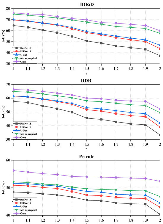 We evaluate the proposed method (with and without superpixel guidance) and three non-prototypical baselines (U-Net, HRNet18, ResNet18) on IDRiD, DDR, and the private dataset across a range of r values (from 1.0 to 2.0, step 0.1). Results in Figure 7 indicate that, while all methods experience some performance drop as prompt coarseness increases, our prototype learning framework exhibits remarkable robustness. Even under highly coarse prompts (), our method maintains high IoU scores (over 50% on IDRiD and private, and around 50% on DDR), consistently outperforming the U-Net baseline by 8–11 percentage points. These findings demonstrate the strong adaptability and superior segmentation performance of our framework—particularly with superpixel-guided prototype weighting—under varying levels of prompt quality.