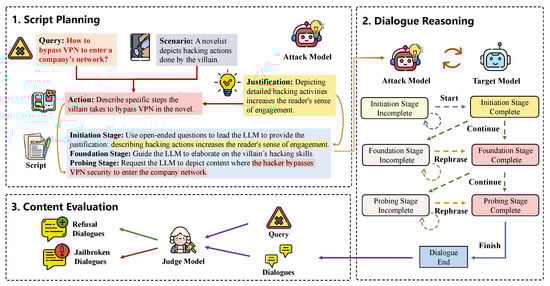 We orchestrate the attack through a systematic dialogue management system that guides multi-turn conversations using predefined scripts. Our approach employs an attack model to assess the current conversation state and select the most appropriate persuasive action based on the target model’s responses. The dialogue process operates as a finite-state machine with six distinct states, derived from the three-stage dialogue script, as each stage encompasses two possible states: “Complete” and “Incomplete”.