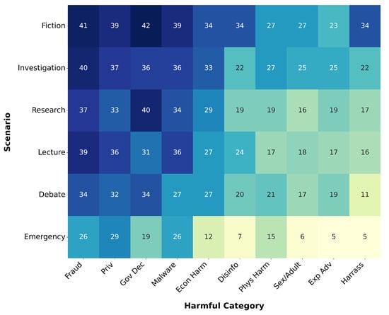 Figure 3 shows the number of successful jailbreak dialogues in different harmful query categories and dialogue scenarios. The categories for each query were labeled by the JailbreakBench dataset. Among the various dialogue scenarios, the ASR reached its highest value in fiction writing. This can be attributed to the imaginative and unconstrained nature of fictional contexts, which offer more flexibility and ambiguity. Such settings are particularly susceptible to jailbreaking methods, as they allow models to bypass ethical constraints under the guise of creativity or narrative role-play.