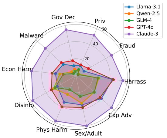 - Mazeika, M.; Phan, L.; Yin, X.; Zou, A.; Wang, Z.; Mu, N.; Sakhaee, E.; Li, N.; Basart, S.; Li, B.; et al. Harmbench: A standardized evaluation framework for automated red teaming and robust refusal. arXiv 2024, arXiv:2402.04249. [Google Scholar] [CrossRef]