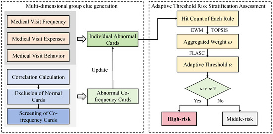 In this section, we introduce a comprehensive data-driven approach designed to detect high-risk organized fraud in medical insurance claims with a focus on drug resale schemes. In Section 3.1, we detail the multi-dimensional clue generation process that aggregates features across frequency, cost, and behavioral dimensions to identify potential fraudulent activities. This step is crucial for extracting clues from large datasets by leveraging both expert knowledge and statistical analysis. In Section 3.2, we describe the spatio-temporal group anomaly analysis technique, which identifies organized fraud networks by analyzing patterns of behavior across time, location, and medication similarity. This method enhances our ability to uncover coordinated fraudulent activities that might not be apparent through individual-level analysis alone. Finally, in Section 3.3, we present a dynamic adaptive threshold risk stratification assessment model that utilizes an ensemble of Entropy Weight Method (EWM), Technique for Order Preference by Similarity to Ideal Solution (TOPSIS), and FLASC [30]. This model dynamically adjusts thresholds based on multi-dimensional aggregated indicators, ensuring robust and adaptable risk classification that minimizes false positives and maximizes detection accuracy. As shown in Figure 1, the overall architecture of our proposed method consists of: (1) an iterative clue generation module for updating individual and group anomalies, (2) anomaly score aggregation using EWM+TOPSIS-based weighting, and (3) adaptive threshold determination via the FLASC clustering approach.