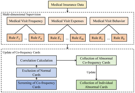 Although the abnormal medical insurance card detection process can identify suspicious clues of individual cards in drug resale, with the continuous escalation of illegal activities, some criminals have begun to utilize groups of individuals eligible for medical insurance drug purchases to illegally obtain drugs through coordinated multi-person drug purchase schemes. In such cases, each medical insurance card within the group may appear normal in isolation, requiring cross-correlation and comparison of these cards to reveal abnormal clues of organized activities. The definition of similar behaviors encompasses multiple dimensions, such as drug purchase time, location, institution, and amount. By analyzing the behavioral patterns of medical insurance cards across multiple dimensions, hidden group drug purchase behaviors can be identified, enabling further detection and correlation of abnormal drug purchase activities within the group. This approach enhances the capability to investigate complex criminal methods. The mining process of abnormal co-frequency cards in medical insurance funds is shown in Figure 2. Following the steps of “co-frequency card screening–normal card exclusion–correlation calculation”, abnormal co-frequency card sets are filtered out by combining threshold values. The input is the detected abnormal card numbers and business data, and the output is the co-frequency card set matching the input abnormal cards. In the co-frequency card screening stage, spatio-temporal feature analysis technology is comprehensively used to focus on screening co-frequency cards with adjacent settlement times in the same medical institution. Meanwhile, to avoid misjudgment, normal cards are excluded by using amount features. Finally, the correlation between medical insurance cards is calculated in the time dimension and content dimension, and the co-frequency card group set is obtained.