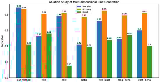 - Without multi-dimension: To validate the effectiveness of our proposed multi-dimensional clue generation module, we designed corresponding ablation studies. Specifically, we conducted experiments using only individual dimensions (frequency, cost, and behavioral dimensions), as well as their pairwise combinations for clue generation, thereby demonstrating the necessity of each rule dimension.