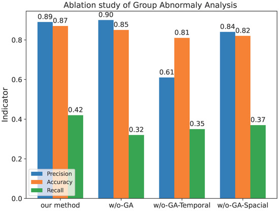 - Without GA: To assess the effectiveness of Group Anomaly analysis proposed in Section 3.2, we only apply anomaly analysis on a single card in multi-dimensional clue generation. Additionally, to demonstrate the necessity of combining temporal and spatial dimensions in our proposed group anomaly detection approach, we designed ablation experiments using solely the spatial dimension or the temporal dimension in isolation.
