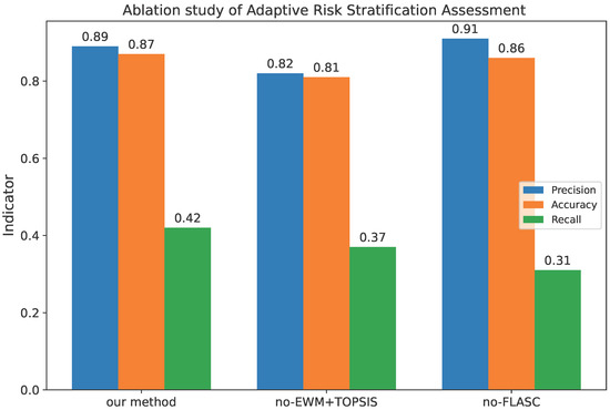 The ablation study on group anomaly detection demonstrates that updating the anomaly clue set based on group anomalies significantly enhances supervision effectiveness, with a notable improvement in recall rate. This indicates the existence of group fraud phenomena in medical insurance fraud scenarios involving drug reselling and reveals the limited effectiveness of individual anomaly detection alone in identifying group fraud, thereby confirming the necessity of the proposed group anomaly detection module. Furthermore, we conducted corresponding ablation experiments on the temporal and spatial dimensions in group anomaly detection. As shown in Figure 4, the precision significantly decreases when either dimension is removed. This demonstrates that the joint analysis of both temporal and spatial dimensions is essential for accurately identifying group anomalous behaviors. Without this combined approach, individual spatial or temporal anomaly detection may yield false positives, potentially misclassifying some normal cases as anomalous. In the ablation study for the adaptive risk assessment module, we first removed the EWM-TOPSIS indicator aggregation component and simply summed the violation scores instead. As shown in Figure 5, both precision and recall decreased when the indicator aggregation was eliminated. Finally, to demonstrate the effectiveness of our clustering-based adaptive threshold generation approach, we classified the top 10% of anomaly scores as high-risk and the remainder as low-risk. As shown in the experimental results, simply relying on statistical score percentiles proves inadequate for accurately identifying medication resale fraud risks, since their characteristics exhibit more complex multi-dimensional patterns. This confirms that clustering algorithms are more appropriate for distinguishing between anomalous and normal clusters by capturing their inherent aggregation features.