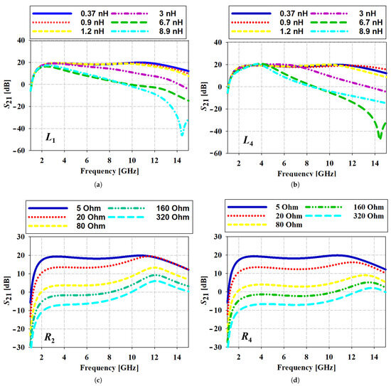 According to the analysis results in previous section, it is observed that the inductor has the highest effect on the gain flatness of the amplifier. As illustrated in Figure 2b, the flatness of the gain is very sensitive to the value of , and variations in cause significant deviations in the gain response; specifically, a decrease in results in reduced voltage gain.