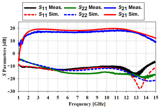 The input return loss () of the fabricated LNA is measured as −8.8 dB at 1 GHz, and remains below −10 dB from 1.6 GHz to 14 GHz, indicating good input matching over a wide frequency range, as shown in Figure 4. Similarly, the output return loss () of the LNA is measured as −5 dB at 1 GHz; then, it drops below −10 dB around 3.5 GHz and maintains this level up to 15 GHz. These results demonstrate that both input and output ports are well matched in the intended operating bandwidth, contributing to the amplifier’s overall performance and stability.