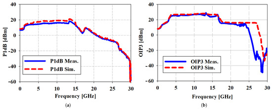 P1dB and OIP3 characteristics of the LNA are illustrated in Figure 6a and Figure 6b, respectively. Both the measured and simulated P1dB values are in good agreement. The P1dB performance remains relatively flat in the operating frequency range of 1.6 GHz to 14 GHz, exhibiting values above 15.5 dBm throughout this band. This confirms that the amplifier maintains linear behavior under high input power conditions. Similarly, the OIP3 performance maintains values around 25.5 dBm between 3 and 13 GHz. This indicates that the LNA offers robust linearity in terms of third-order intermodulation distortion throughout the wideband operating range. Based on these measurements, the corresponding input-referred third-order intercept point (IIP3) is 8.5 dBm, as seen in Figure 7.