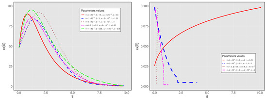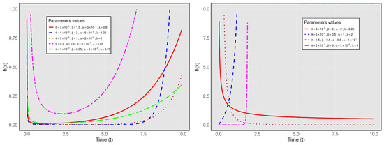 where . Equation (14) establishes that and can independently determine the distribution of failure times of the ED denoted by . In turn, the reciprocal of the MRL and HRF of is equivalent to . H. Olcay [45] proposed the relationship based on the shape of the HRF and the MRL; for this, he established that if , the failure times of the device under analysis will have a BHCR. At the same time, the MRL will exhibit an inverted behavior to the BHCR. On the other hand, if , the shape of the HRF will be an inverted BHCR, and the MRL will have a BHCR behavior.