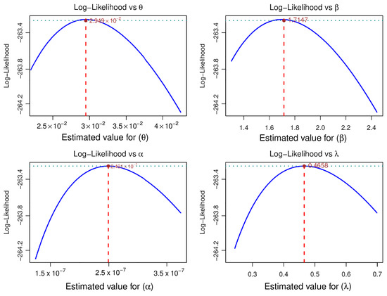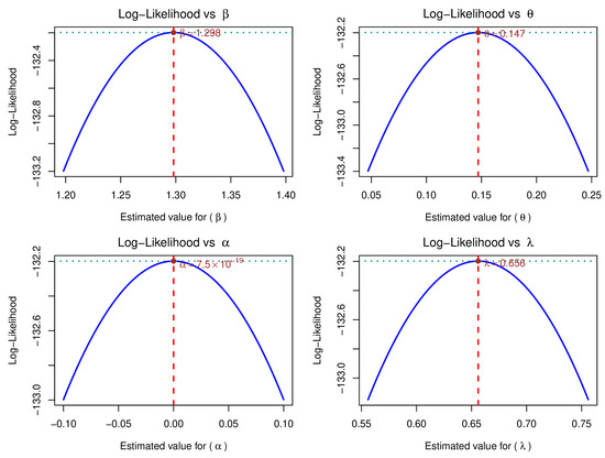 Given Equations (4) and (5), let us start from the fact that for the reliability analysis, we have P EDs, which are built with the same internal components and under the same manufacturing processes, and the operation of these ED are independent of each other. In turn, the EDs under analysis has two FaM identified as FaM1 and FaM2, that is, . Also, let be the record of ı’s failure time of FaM1 and FaM2, respectively, these failures are in the range where and , so it is assumed that two FaMs describe the model with properties of modeling monotone and non-monotone behaviors.