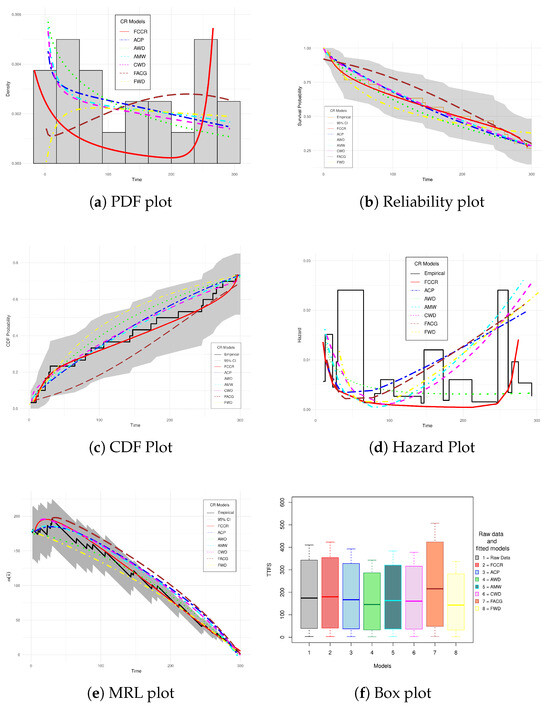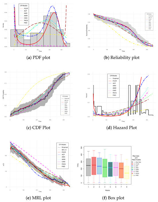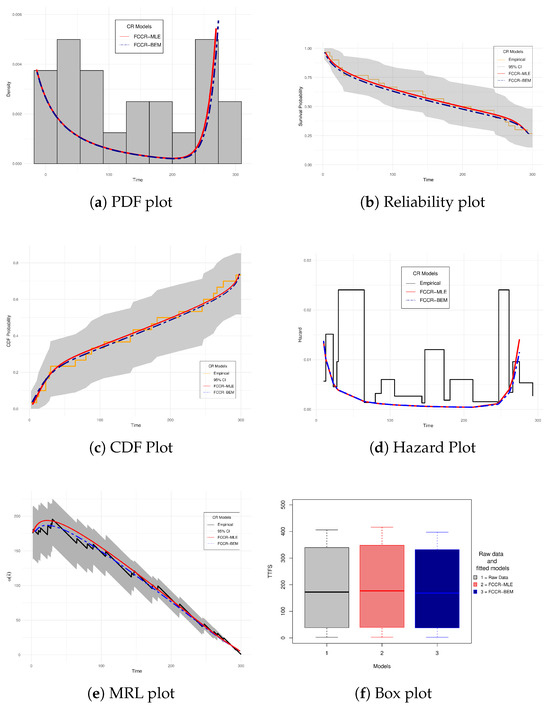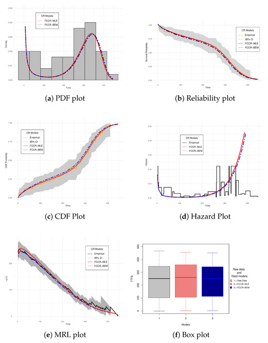 The results obtained from the case studies provide strong evidence for reliability practitioners regarding the applicability of the FCCR model in the analysis of EDs’ lifetimes. The summaries presented in Table 4 and Table 7 demonstrate that the proposed model exhibits competitive and in many cases superior performance compared to other models reported in the current literature, as supported by the corresponding statistical indicators. Moreover, the reliability curves shown in Figure 7 and Figure 12 reveal that the FCCR closely aligns with the empirical curves of the PDF, SF, CDF, and MRL, reinforcing the consistency of the statistical outcomes. Finally, the risk probabilities reported in Table 5 and Table 8 indicate that the FCCR accurately captures the failure associated with each FaM observed in the EDs. From a practical standpoint, these results highlight the FCCR’s ability to provide a robust balance between statistical estimation, graphical fit, and the computation of failure risk probabilities.