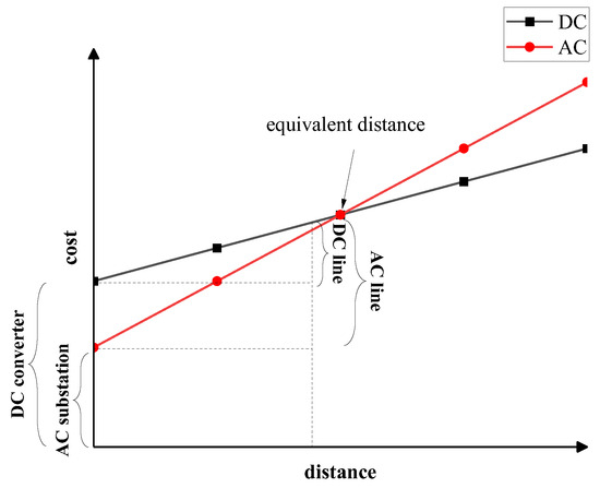 Although the precise calculation of the cost is hard at the early stage of planning, basic conclusions about the economic efficiency of AC/DC transmission can be drawn based on a large amount of engineering experience. The cost of a DC converter station is higher than that of an AC substation, while the cost per unit length of a DC transmission line is lower than that of an AC transmission line, and an economic equivalent distance exists. The relative relationship between the construction cost and transmission distance is shown in Figure 2.