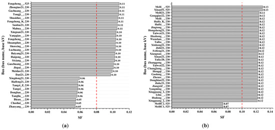 (2) The shift factors of the sending-end and receiving-end embedded points are further calculated, which are shown in Figure 7. The embedded points with smaller SF values are excluded, making sure the scheme effectively increases the load margin. Based on the previous value of kdc, the sending-end embedded points with SF less than 0.08 and receiving-end embedded points with SF less than 0.1 are excluded. The minimum shift factors are indicated by the red lines in Figure 7.