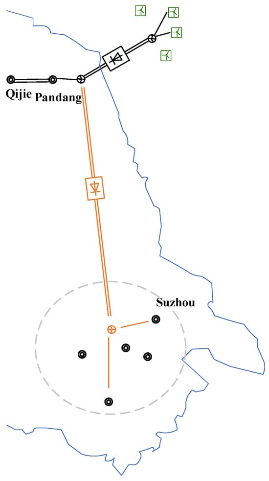 In the latter case (the scheme in orange in Figure 8), suppose it is desired to directly transmit the wind power to Suzhou. Here, the 500 kV busbars in Suzhou are selected as alternative embedded points.