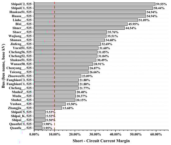 (2) Considering that VSC-HVDC transmission is used for offshore wind power, it may contribute a certain short-circuit current. Calculate the three-phase short-circuit current margin of the embedded points, as shown in Figure 9. Exclude the busbars with insufficient short-circuit current margins. Here, the busbars with a short-circuit current margin of less than 10% are excluded. The minimum margin is indicated by the red line in Figure 9.